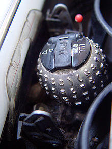 Tilt and rotate movements are transferred to the carrier (the mechanism that supports the element), which moves across the page, by two taut metal tapes, one for tilt and one for rotate. The tilt and rotate tapes are both anchored to the right side of the carrier. They both wrap around separate pulleys at the right side of the frame; the tilt pulley is fixed, while the rotate pulley is attached to the shift arm, actuated by the Shift and Caps Lock keys.[26] The tapes extend across the machine behind the carrier, and then wrap around two separate pulleys at the left side of the frame. The tilt tape is then anchored to a small, quarter-circle pulley which, through a link, tips the tilt ring (the device to which the element is connected) to one of four possible locations. The rotate tape is wrapped around a spring-loaded pulley located in the middle of the carrier. The rotate pulley under the tilt ring is connected through a universal joint (called a "dog bone", which it resembles) to the center of the tilt ring. The element is spring-latched onto that central post. The element rotates counter-clockwise when the rotate tape is tightened. The spiral "clock" spring underneath the rotate pulley rotates the element in the clockwise direction. As the carrier moves across the page (such as when it returns), the tapes travel over their pulleys, but the spring-loaded pulleys on the ball carrier do not pivot or rotate.
