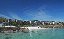 The main settlement, located at St. Ronan's Bay on the eastern side of the island, is called Baile Mòr and is also known locally as "The Village". The primary school, post office, the island's two hotels, the Bishop's House and the ruins of the Nunnery are here. The Abbey and MacLeod Centre are a short walk to the north.[5][26] Port Bàn (white port) beach on the west side of the island is home to the Iona Beach Party.[27]