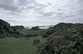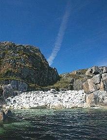 The remains of a marble quarrying enterprise can be seen in a small bay on the south-east shore of Iona.[44] The quarry is the source of 'Iona Marble', a beautiful translucent green and white stone, much used in brooches and other jewellery.[45] The stone has been known of for centuries and was credited with healing and other powers. While the quarry had been used in a small way, it was not until around the end of the 18th century when it was opened up on a more industrial scale by the Duke of Argyle.[46] The then difficulties of extracting the hard stone and transporting it meant that the scheme was short lived. Another attempt was started in 1907, this time more successful with considerable quantities of stone extracted and indeed exported, but the First World War put paid to this as well, with little quarrying after 1914 and the operation finally closing in 1919. A painting showing the quarry in operation, The Marble Quarry, Iona (1909) by David Young Cameron, is in the collection of Cartwright Hall art gallery in Bradford.[47] Such is the site's rarity that it has been designated as a Scheduled Ancient Monument.[48]