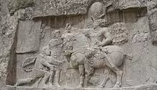 The term Iran derives directly from Middle Persian Ērān, first attested in a third-century inscription at Rustam Relief, with the accompanying Parthian inscription using the term Aryān, in reference to the Iranians.[32] The Middle Iranian ērān and aryān are oblique plural forms of gentilic nouns ēr- (Middle Persian) and ary- (Parthian), both deriving from Proto-Iranian *arya- (meaning "Aryan", i.e. "of the Iranians"),[32][33] recognized as a derivative of Proto-Indo-European *ar-yo-, meaning "one who assembles (skilfully)".[34] In the Iranian languages, the gentilic is attested as a self-identifier, included in ancient inscriptions and the literature of the Avesta,[35][b] and remains also in other Iranian ethnic names Alan (Ossetian: Ир Ir) and Iron (Ирон).[33] According to the Iranian mythology, the country's name comes from the name of Iraj, a legendary prince and shah who was killed by his brothers.[36]