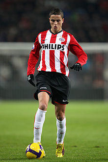 Afellay left Elinkwijk in 1996 for PSV.[6] Afellay's official debut for PSV was on 4 February 2004 during a KNVB Cup match against NAC Breda at the age of 17. His first Eredivisie fixture followed ten days later against FC Twente.[7] Afellay played one more senior match in the 2003–04 season.[8] He signed a new contract at PSV in May that would run until 2007.[9] In the next season, Afellay got a place in the first eleven against Roda JC in December.[10] But during the winter break training camp in Dubai, he suffered a broken toe.[11] Afellay was unable to play for three months.[12] He played nine matches in total in the 2004–05 season; his most memorable being PSV's final home match against Feyenoord (2–4). Afellay scored twice and provided an assist in the match.[6][13] He also won the KNVB Cup after appearing as a substitute in the final against Willem II, which PSV won 4–0.[8]