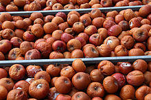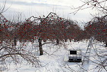 In this method, frozen apples are left on the branch until the middle of winter, where they are dried out by the cold, the sun and the wind. They are picked when the temperature is between −15 to −8 °C (5 to 18 °F), usually after 3 nights at those temperatures.[5] This can require a large amount of labor on short notice and completely determined by the weather,[6] so it is possible to harvest the apples at maturity and leave them outside until the weather is cold enough. This technique is very similar to how Amarone or straw wine is created, and is identical to the production of ice wine.