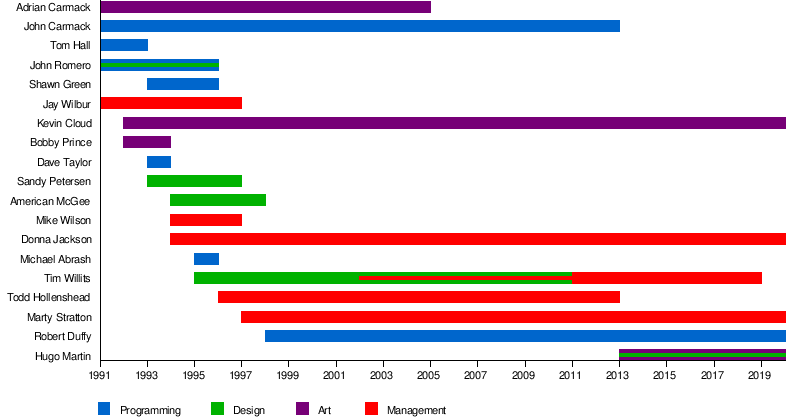- John Carmack — Co-founder, technical director (1991–2013). He joined Oculus VR on August 7, 2013, as a side project, but unable to handle two companies at the same time, Carmack resigned from id Software on November 22, 2013, to pursue Oculus full-time, making him the last founding member to leave the company.