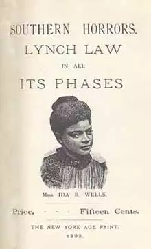 On October 26, 1892, Wells began to publish her research on lynching in a pamphlet titled Southern Horrors: Lynch Law in All Its Phases.[33][34] Having examined many accounts of lynchings due to the alleged "rape of White women", she concluded that Southerners cried rape as an excuse to hide their real reasons for lynchings: Black economic progress, which threatened White Southerners with competition, and White ideas of enforcing Black second-class status in the society. Black economic progress was a contemporary issue in the South, and in many states Whites worked to suppress Black progress. In this period at the turn of the century, Southern states, starting with Mississippi in 1890, passed laws and/or new constitutions to disenfranchise most Black people and many poor White people through use of poll taxes, literacy tests and other devices. Wells-Barnett recommended that Black people use arms to defend against lynching.[35]