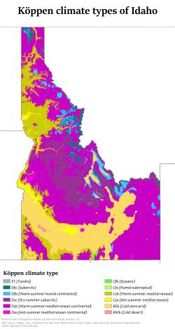 Idaho's climate varies widely. Although the state's western border is about 350 miles (560 km) from the Pacific Ocean, the maritime influence is still felt in Idaho, especially in the winter when cloud cover, humidity, and precipitation are at their maximum extent. This influence has a moderating effect in the winter where temperatures are not as low as would otherwise be expected for a northern state with predominantly high elevations.[20] The maritime influence is least prominent in the state's eastern part where the precipitation patterns are often reversed, with wetter summers and drier winters, and seasonal temperature differences are more extreme, showing a more semi-arid continental climate.[21]