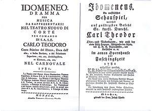 Idomeneo, re di Creta ossia Ilia e Idamante (Italian for Idomeneus, King of Crete, or, Ilia and Idamante; usually referred to simply as Idomeneo,[1] K. 366) is an Italian language opera seria by Wolfgang Amadeus Mozart. The libretto was adapted by Giambattista Varesco from a French text by Antoine Danchet, based on a 1705 play by Crébillion père, which had been set to music by André Campra as Idoménée in 1712. Mozart and Varesco were commissioned in 1780 by Karl Theodor, Elector of Bavaria for a court carnival. He probably chose the subject, though it may have been Mozart.[2] The work premiered on 29 January 1781 at the Cuvilliés Theatre in Munich, Germany.