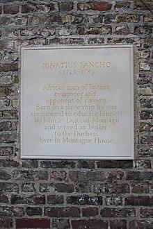 - A plaque to the memory of Sancho was unveiled on 15 June 2007, by Nick Raynsford, MP for Greenwich, on the remaining wall of Montagu House on the south-west boundary of Greenwich Park. The plaque was funded by the Friends of Greenwich Park to commemorate the bicentenary of the Abolition of the Slave Trade Act, made law in 1807. A second plaque to his memory is on the Foreign and Commonwealth Office.[26]