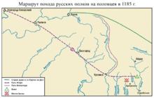 When Khan Konchak with his Donets Cumans pillaged the Pereyaslavl lands in February 1184, Svyatoslav Vsevolodovich sent his sons and his troops to Igor ordering him to pursue the tribesmen.[1] Svyatoslav Vsevolodovich's co-ruler, Rurik Rostislavich, for his part, sent his troops under the command of prince Vladimir Glebovich of Pereyaslavl.[1] Igor was appointed to command all the troops of the Olgovichi, and he refused Vladimir Glebovich permission to spearhead the attack, because the vanguard contingent would get the first chance to grab the booty.[1] Shortly afterwards, Volodymer Hlibovich pillaged the Seversk towns of the Olgovichi and rode off in a huff; Igor also sent the Kievan troops home.[1] Consequently, Igor went in pursuit of the Cumans with a greatly diminished force, including some Black Hats.[1] Igor pursued the raiders, found them at the river Khiriya (a tributary of the Vorskla), and took many captive.[1] On his way home, he probably attacked Vladimir Glebovich's town of Glebov (on the right bank of the Trubizh River).[1]