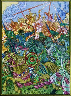 On his campaign against the Cumans, a heroic poem was written which is the peak of Old East Slavic poetry.[6] As a matter of fact, scholars still argue as to whether the Lay of Igor’s Campaign is written in verse or in rhythmic prose; in either case, it is poetry at its height and its language is racy and powerful.[6] Besides rhythm, the poetic elements of the Lay comprise an extremely rich imagery constructed primarily on parallels with nature, symbolism, poetic address, and lyric lamentation.[4]