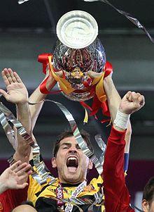 With the exclusion of his Real Madrid teammate Raúl from the squad for Euro 2008, Casillas was given the captain's armband. He started the first two Group D games against Russia and Sweden before being rested in place of second-choice goalkeeper Pepe Reina for Spain's group stage elimination of Greece. Casillas saved two penalties from Antonio Di Natale and Daniele De Rossi as Spain eliminated Italy in the quarter-finals with a 4–2 shootout win following a goalless draw on 22 June.[77] Spain later went on to win the competition with a 1–0 win over Germany in the final on 29 June. Casillas kept clean sheets in all of the quarter-final, semi-final and final matches, with Sweden's first round goal by Zlatan Ibrahimović being the last one scored against him. On 29 June 2008, Casillas became the first goalkeeper-captain to lift the UEFA European Championship trophy when Spain beat Germany in the final.[78]