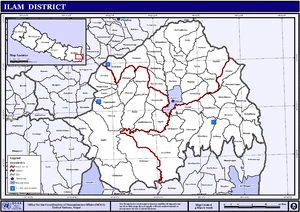 Ilam district (Nepali: इलाम जिल्ला) is one of 14 districts of Province No. 1 of eastern Nepal. It is a Hill district and covers 1,703 km2 (658 sq mi). The 2011 census counted 290,254 population.[1] The municipality of Ilam is the district headquarters, about 600 km (370 mi) from Kathmandu.