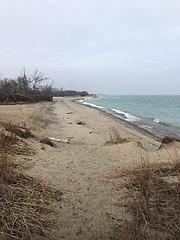 The entry to the beach is usually from a parking area on its north side: north of this carpark is usually the most crowded area in the summer time. South, the beach is less crowded and a mile of shoreline extends to an inlet into a wetland. Depending on weather conditions this inlet may be blocked by a berm from the lake waters, and again depending on weather conditions the water inside the berm may be significantly warmer than Lake Michigan which is rather cold until August.