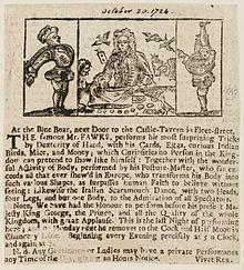 Until the 18th century, magic shows were a common source of entertainment at fairs, where itinerant performers would entertain the public with magic tricks, as well as the more traditional spectacles of sword swallowing, juggling and fire breathing. In the early 18th century, as belief in witchcraft was waning, the art became increasingly respectable and shows would be put on for rich private patrons. A notable figure in this transition was the English showman, Isaac Fawkes, who began to promote his act in advertisements from the 1720s—he even claimed to have performed for King George II. One of Fawkes' advertisements described his routine in some detail:
