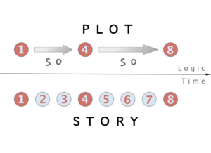 The first event is causally related to the third event, while the second event, though descriptive, does not directly impact the outcome. As a result, according to Dibell, the plot can be described numerically as 1→3 while the story can be described as 1→2→3. A story orders events from beginning to end in a time sequence.[1]