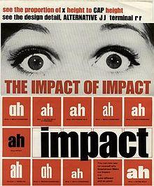 During the 1960s, there was a trend towards condensed, bold, "industrial" sans-serifs like Schmalfette Grotesk and Compacta, largely pioneered by West German magazine Twen,[1] and Impact was intended to fit this trend.[4] Writing in 2004, the year before his death, Lee explained that the design goal was "to get as much ink on paper as possible in a given size with the maximum possible x-height" and to provide a home-grown metal type alternative to European designs in the style (e.g. Schmalfette Grotesk, illustrated in Lettera, a contemporary anthology series of lettering), which were complicated for British businesses to license and use.[5][6][7][8] Lee wrote that "many of us admired the vitality and colour of what we knew only as Schmalfette, and used it by old-fashioned cut and paste. Use was limited as it was never made in metal as far as I know, and existed then in capitals and numerals only".[5] (Schmalfette Grotesk was later digitised, with an added lower-case, as Haettenschweiler by Eraman Ltd.[9]) Other designs along the same lines from around the same period included the Letraset face Compacta,[7] Matthew Carter's slightly earlier masthead of Private Eye (which is caps-only but based on a never-released typeface with a lower case),[10][11] and the phototypesetting Helvetica Compressed, also by Carter and released a few years later.[12][13]