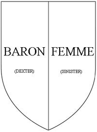 The husband's arms are shown in the dexter half (on the right hand of someone standing behind the shield, to the viewer's left), being the place of honour, with the wife's paternal arms in the sinister half. For this purpose alone the two halves of the impaled shield are called baron and femme, from ancient Norman-French usage.[1] Impalement is not used when the wife is an heraldic heiress, that is to say when she has no brothers to carry on bearing her father's arms (or, if her brothers have died, they have left no legitimate descendants) in which case her paternal arms are displayed on an escutcheon of pretence in the centre of her husband's arms, denoting that the husband is a pretender to the paternal arms of his wife, and that they will devolve upon the couple's heir(s) as quarterings. When a husband has been married more than once, the sinister half of femme is split per fess, that is to say horizontally in half, with the paternal arms of the first wife shown in chief and those of the second wife in base. The sinister side may thus be divided more than twice in similar fashion where required.
