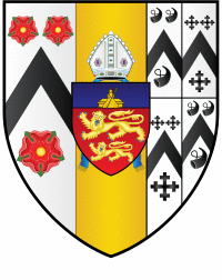 The arms of Brasenose College, Oxford are: Tierced in pale: (1) Argent, a chevron sable between three roses gules seeded or, barbed vert (for Smyth); (2) or, an escutcheon of the arms of the See of Lincoln (gules, two lions of England in pale or, on a chief azure Our Lady crowned seated on a tombstone issuant from the chief, in her dexter arm the Infant Jesus, in her sinister arm a sceptre, all or), ensigned with a mitre proper; (3) quarterly, first and fourth argent, a chevron between three bugle-horns stringed sable; second and third argent, a chevron between three crosses crosslet sable (for Sutton).[5]