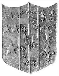 The arms of Sir Arthur Northcote, 2nd Baronet (1628–1688), sculpted on his ledger stone in King's Nympton Church, Devon, England, UK, show a shield tierced per pale, the second (central) part showing his paternal arms of four quarters. The dexter part relates to his first wife Elizabeth the daughter of James Walsh of Alverdiscot in Devon, and shows the arms of Walshe (six mullets 3:2:1). The sinister part relates to his second wife Elizabeth the daughter of Sir Francis Godolphin of Godolphin in Cornwall, England, UK, and shows the arms of Godolphin (an eagle displayed double headed between three fleurs-de-lis).