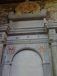 The use of impaled arms serves to identify with precision which member of the male line of a family is represented, if the identity of his wife is known, for example from a pedigree. Frequently impaled arms appear sculpted on ancient buildings, thus allowing architectural historians to identify the builder. Impaled arms also appear frequently on monuments in parish churches, and again facilitate identification of the person for whom erected. A convenient and descriptive term for "a heraldic escutcheon showing the impaled arms of a husband and wife" is "a match", and this word was used frequently by, amongst others, Tristram Risdon (d.1640) in his manorial history Survey of Devon. For example: "The north aisle of Swimbridge Church was built by Sir John Mules of Ernsborough, as the inscription in a window, and a proof there once fairly printed and guilded, with the arms and matches of that family, make evident".[2] Also: "(William Hankford) is pourtraited kneeling in his robes together with his own match and the match of some of his ancestors insculpt thereon in brass"[3] (in Monkleigh Church, Devon).