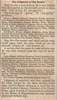 | Articles of Impeachment, U.S. Senate judgment (36 "guilty" votes necessary for a conviction) | |||||||||||||||||||||||||||||||||||||||||||||||||||||||||||||||||||||||||||||||||||||||||||||||||||||||||||||||||||||||||||||||||||||||||||||||||||||||||||||||||||||||||||||||||||||||||||||||||||||||||||||||||||||||||||||||||||||||||||||||||||||||||||||||||||||||||||||||||||||||||||