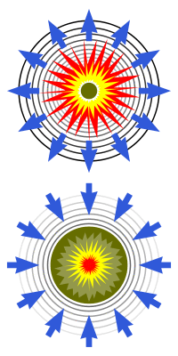 Implosion is a process in which objects are destroyed by collapsing (or being squeezed in) on themselves. The opposite of explosion (which expands the volume), implosion reduces the volume occupied and concentrates matter and energy. True implosion usually involves a difference between internal (lower) and external (higher) pressure, or inward and outward forces, that is so large that the structure collapses inward into itself, or into the space it occupied if it is not a completely solid object. Examples of implosion include a submarine being crushed from the outside by the hydrostatic pressure of the surrounding water, and the collapse of a massive star under its own gravitational pressure.