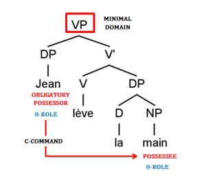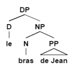 Inalienable possession constructions involve two nouns or nominals: the possessor and the possessee. Together, they form a unit, called a determiner phrase (DP). Within the DP, the possessor nominal may occur either before the possessee (prenominal) or after its possessee (postnominal), depending on the language.[12] French, for example, can use a postnominal possessor (the possessor (of) Jean occurs after the possessee the arm):