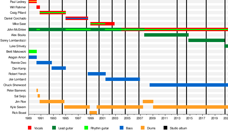 The band has seen many lineup changes in their 32-year history. Guitarist/vocalist McEntee is the sole original member, though drummer Kyle Severn has appeared on every studio album since their third full-length, Diabolical Conquest. Incantation first came to prominence with Onward to Golgotha and Mortal Throne of Nazarene, both of which feature Craig Pillard on vocals. Following the release of the Forsaken Mourning of Angelic Anguish EP in 1997, Pillard departed the band and was replaced by Daniel Corchado of The Chasm. Corchado performed on one album, 1998's Diabolical Conquest, before departing. Vocalist Mike Saez performed on the next two albums, The Infernal Storm (2000) and Blasphemy (2002). Beginning with Decimate Christendom, McEntee took on vocal responsibilities, a role that he continues to the present.