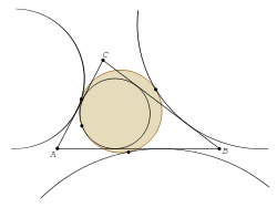 The circular hull of the excircles is internally tangent to each of the excircles and is thus an Apollonius circle.[29] The radius of this Apollonius circle is where is the incircle radius and is the semiperimeter of the triangle.[30]