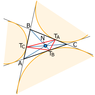The Nagel triangle or extouch triangle of is denoted by the vertices , , and that are the three points where the excircles touch the reference and where is opposite of , etc. This is also known as the extouch triangle of . The circumcircle of the extouch is called the Mandart circle.