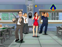 The first family member to be focused on is father Taneo, who is routinely working in his office (albeit quite tiredly) when suddenly he is ordered to dance by his supervisor along with his peers. After doing so in quite a frenzy, his co-workers then run off, looking quite scared and seem to be running away from something. Taneo turns round to investigate, when he sees a giant boulder-like statue part (which was being placed onto a statue nearby, but accidentally came off) come crashing through the wall; and is forced to run down corridors from it, until he reaches the safety of an elevator which he uses to descend. However, the boulder comes crashing from above, shooting debris down while Taneo desperately works on activating an emergency stop. Eventually, the boulder also shoots down onto the elevator, and in an explosion, Taneo is shot out of the window. Falling to certain death, Taneo luckily grabs onto a flagpole - but unfortunately, it cannot take his weight, and thus Taneo falls once more; but various things slow his descent, and he lands safely. The boulder emerges again through the building's main entrance, but he easily evades it - not long after though, a piece of the statue which was holding the flagpole lands on his head, knocking him unconscious. He later wakes up in an ambulance, strapped to a stretcher while the paramedics ask him questions to check his thinking state. After answering the questions correctly, they accidentally send Taneo - still strapped to the stretcher - out of the ambulance and into the traffic, due to their over-excitement. However, Taneo successfully dodges the traffic and breaks free of his restraints; but when he does so, he crashes into the boulder from before (which miraculously appears). When he recovers, he is helped by an attractive lady, who soon leaves him. Taneo, seemingly in love, follows her onto a Ferris wheel and gives her an erotic back-massage (in this scene, the two characters are only heard but not seen. In the North American version, it is said to be a "back massage", but in the Japanese original, it was hinted at it being a far more sexual act, and although the American version downplayed this, the female still belts out orgasmic-sounding screams when Taneo is successful). Afterwards, she suddenly jumps from the Ferris wheel and onto a helicopter, before pointing out she left a bomb behind Taneo. The bomb explodes, sending Taneo onto the helicopter. Soon he makes it off and sees a UFO, which two navy ships are trying to destroy - for some reason however, Taneo commandeers a turret and shoots down their missiles, saving the UFO. Eventually, Taneo himself is shot upon by a missile, exploding the turret and sending him high into the sky - but somehow lands safely and gets onto a boat. He gets curious about a block on the boat and removes it, which unwittingly starts sinking the boat. Taneo and the boat owner successfully block the hole and get back to shore, where Taneo decides to take an underground train (possibly to avoid any more madness). Once boarding the train, he finds it strangely empty, and the attractive woman from before appears, revealing she has cut the brakes of the train. The train crashes into various blockings on the tracks and shoots up from the underground, where Taneo finds himself miraculously outside of Hatsu's house.