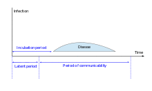 While latent or latency period may be synonymous, a distinction is sometimes made between incubation period, the period between infection and onset of the disease, and latent period, the time from infection to infectiousness. Which period is shorter depends on the disease. A person may carry disease, such as Streptococcus in the throat, without exhibiting any symptoms. Depending on the disease, the person may or may not be contagious during the incubation period.