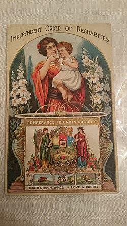 The Independent Order of Rechabites (IOR), also known as the Sons and Daughters of Rechab,[1] is a fraternal organisation and friendly society founded in England in 1835 as part of the wider temperance movement to promote total abstinence from alcoholic beverages.[2] Always well connected in upper society and involved in financial matters, it gradually transformed into a financial institution which still exists, and still promotes abstinence. The Order has been active in Australia from 1843, promoting temperance and as a benefit society. A branch was established in the United States in 1842, and also flourished for a time. In the United Kingdom, the Order trades under the name of Healthy Investment.