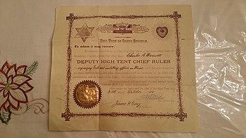In the United States and Canada there were several orders of Rechabites including the Independent Order of Rechabites of North America and the Encamped Knights of Rechab of North America.[10][11] The most successful, however, was the Independent Order of Rechabites which was founded in 1842, and was reported to have 990,000 at the beginning of the twentieth century. Like the Order in Britain, its local groups were called Tents. The national structure was the "High Tent" and the order was headquartered in Washington, DC. Membership was open to males aged 16 to 55, females aged twelve and up, and juveniles aged 5-16; the primary tents were composed of males 16–55 years old who believed in a Supreme Being and signed a total abstinence pledge. Individuals over fifty five were admitted as honorary members, and females over twelve and males under sixteen were permitted to form their own Tents. The Order worked three degrees: Knight of Temperance, Knight of Fortitude and Covenanted Knight of Justice.[12]