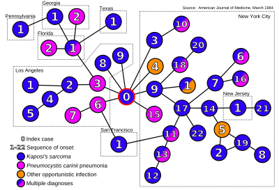 In the early years of the AIDS epidemic, a patient zero transmission scenario was compiled by Dr. William Darrow and colleagues at the United States Centers for Disease Control and Prevention (CDC).[14] This epidemiological study showed how patient zero had infected multiple partners with HIV, and they, in turn, transmitted it to others causing rapid spread of the virus to locations all over the world (Auerbach et al., 1984). The CDC identified Gaëtan Dugas as a carrier of the virus from Europe to the United States, who spread it to other men he had intimate relations with at gay bathhouses.[15]