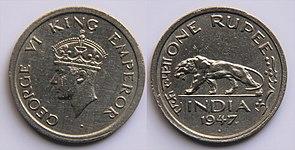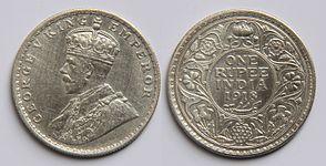 1933 One Quarter anna featuring George V on obverse and face value, country and year on reverse.