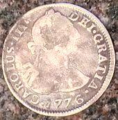 A Spanish colonial two-reales piece ("two bits") from the Potosí Mint (today in Bolivia)