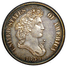 By numismatic legend, the facial features of the goddess Liberty on the obverse of the Indian Head cent were based on the features of Longacre's daughter Sarah; the tale runs that she was at the mint one day when she tried on the headdress of one of a number of Native Americans who were visiting, and her father sketched her. However, Sarah Longacre was 30 years old and married in 1858, not 12 as in the tale, and Longacre himself stated that the face was based on a statue of Crouching Venus in Philadelphia on loan from the Vatican.[7] He did often sketch his elder daughter, and there are resemblances between the depictions of Sarah and the various representations of Liberty on his coins of the 1850s. These tales were apparently extant at the time, as Snowden, writing to Treasury Secretary Howell Cobb in November 1858, denied that the coin was based "on any human features in the Longacre family".[10][11] Lee F. McKenzie, in his 1991 article on Longacre, notes that any artist can be influenced by many things, but calls the story "essentially false".[12]