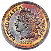 In the postwar years, the heavy production of cents was scaled back, as hoarding ceased and some of the slack was taken up by other base-metal coins.[43] Nevertheless, the various issues of small coins, at that time not redeemed by the government, caused another glut in commerce, which was not completely broken until the Act of March 3, 1871, allowed redemption of cents and other minor coins in lots of $20 or more.[38] Pursuant to this act, over thirty million copper-nickel cents, of both the Indian Head and Flying Eagle designs, were redeemed; the Mint melted these for recoinage. Fifty-five million bronze cents were also sold to the government; beginning in 1874, the Mint re-issued these in response to commercial requests for cents, lowering the demand for new coins.[44] Drops in the price of silver brought coins of that metal, hoarded for a decade or more, back into commerce, also decreasing demand. Between 1866 and 1878, production only occasionally exceeded ten million; the 1877 coin, with a circulation mintage of 852,500, is a rare date for the series.[43] After 1881, there were few redemptions of bronze cents, due to high demand for the denomination, though copper-nickel cents continued to be redeemed and melted.[45]