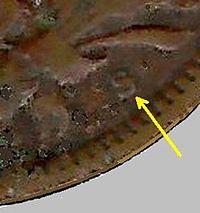'S' mint mark (designated with arrow) on the reverse of a 1908 S Indian head penny