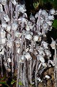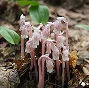 Unlike most plants, it is white and does not contain chlorophyll.[4] Instead of generating energy from sunlight, it is parasitic, and more specifically a mycoheterotroph. Its hosts are certain fungi[4] that are mycorrhizal with trees, meaning it ultimately gets its energy from photosynthetic trees. Since it is not dependent on sunlight to grow, it can grow in very dark environments as in the understory of dense forest. It is often associated with beech trees.[5] The complex relationship that allows this plant to grow also makes propagation difficult.
