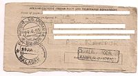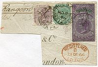 Shortages developed, so stamps also had to be improvised. Some "Service Postage" overprinted rarities resulted from abrupt changes in postal regulations. New designs for the four-anna and six-anna-eight-pie stamps were issued in 1866. Nevertheless, there was a shortage of stamps to meet the new rates. Provisional six-anna stamps were improvised by cutting the top and bottom from a current foreign-bill revenue stamp and overprinting "Postage". India was the first country in the Commonwealth to issue airmail stamps.[27]