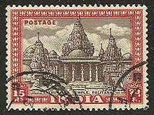 India attained independence on 15 August 1947. Thereafter, the Indian Posts and Telegraph Department embarked on a broad-based policy for the issuance of stamps. On 21 November 1947 the first new stamp was issued by independent India. It depicts the Indian flag with the patriots' slogan, Jai Hind ("long live India"), at the top right-hand corner. The stamp was valued at three and one-half annas. A memorial to Mahatma Gandhi was issued 15 August 1948 on the first anniversary of independence. One year later a definitive series appeared, depicting India's broad cultural heritage (primarily Hindu, Buddhist, Muslim, Sikh and Jain temples, sculptures, monuments and fortresses). A subsequent issue commemorated the beginning of the Republic of India on 26 January 1950. Definitives included a technology-and-development theme in 1955, a series depicting a map of India in 1957 (denominated in naya paisa—decimal currency) and a 1965 series with a wide variety of images. The old inscription "India Postage" was replaced in 1962 with "भारत INDIA", although three stamps (issued from December 1962 to January 1963) carried the earlier inscription.[28]