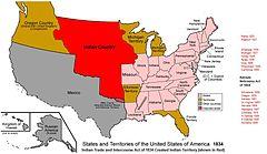 Indian Territory, also known as the Indian Territories and the Indian Country, was land within the United States of America reserved for the forced re-settlement of Native Americans. Therefore, it was not a traditional territory for the tribes settled upon it.[1] The general borders were set by the Indian Intercourse Act of 1834. The territory was located in the Central United States.