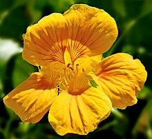 Tropaeolum /trəˈpiːələm, troʊ-/,[1][2] commonly known as nasturtium (/nəˈstɜːrʃəm, næ-/;[3][4][5] literally "nose-twister" or "nose-tweaker"), is a genus of roughly 80 species of annual and perennial herbaceous flowering plants. It was named by Carl Linnaeus in his book Species Plantarum,[6] and is the only genus in the family Tropaeolaceae. The nasturtiums received their common name because they produce an oil similar to that of watercress (Nasturtium officinale).