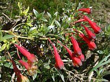 The flame flower (Tropaeolum speciosum) is well adapted to cool, moist climates and famously does well in Scotland. It sends up shoots which thread their way through hedges and shrubs and which, when they emerge into the light, bear brilliant red flowers among small, five or six-lobed leaves. It is difficult to establish but is an attractive garden plant when it thrives.[10] This plant has gained the Royal Horticultural Society's Award of Garden Merit.[20]