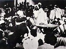 Mahatma Gandhi returned from South Africa in 1915.[42] With the help of the moderate group led by Ghokhale, Gandhi became president of Congress. After the First World War, the party became associated with Gandhi, who remained its unofficial spiritual leader and icon.[43] He formed an alliance with the Khilafat Movement in 1920 to fight for preservation of the Ottoman Caliphate, and rights for Indians using civil disobedience or satyagraha as the tool for agitation.[44] In 1923, after the deaths of policemen at Chauri Chaura, Gandhi suspended the agitation. In protest, a number of leaders, Chittaranjan Das, Annie Besant, and Motilal Nehru, resigned to set up the Swaraj Party. The Khilafat movement collapsed and Congress was split.[45]