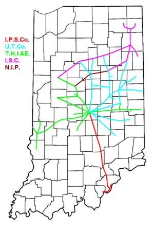 The late 1890s was a time of horse-drawn carriages and wagons pulled along unpaved streets and roads, so the arrival of the town streetcar was appreciated. Some of these trolley lines eventually expanded into the countryside and by 1911 grew into hundreds of miles of interurban lines networked across Indiana. "When before we had moved by horse and carriage, we now rode on plush seats to places 20 miles (32 km), 30 miles (48 km), even 50 miles (80 km) distant."[1] In 1930, this unprofitable network became the new Indiana Railroad interurban. The plan was to increase both passenger and freight business and improve efficiency. A brief description of these IR predecessor interurban companies follows.