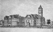 Originally built as the library in 1909, Normal Hall is the last remaining structure from Indiana State's Normal School era.[16] Normal Hall served as the university library until Cunningham Memorial Library was built in 1974 and named in honor of Indiana State's first Librarian, Arthur Cunningham (1891–1928). On the centennial of Normal Hall's construction, it was announced that it would be fully remodeled and will become a student academic honors center.[17] The 2014–15 renovation was approximately $16 million; the original grand staircase and a stained-glass dome featuring images of at least 24 educators and philosophers were restored and the building now meets ADA requirements.[18]