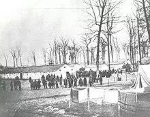 Indianapolis became a major logistics hub during the war, establishing the city as a crucial military base.[49][50] Between 1860 and 1870, the city's population more than doubled.[43] An estimated 4,000 men from Indianapolis served in 39 regiments, and an estimated 700 died during the war.[51] On May 20, 1863, Union soldiers attempted to disrupt a statewide Democratic convention at Indianapolis, forcing the proceedings to be adjourned, sarcastically referred to as the Battle of Pogue's Run.[52] Fear turned to panic in July 1863, during Morgan's Raid into southern Indiana, but Confederate forces turned east toward Ohio, never reaching Indianapolis.[53] On April 30, 1865, Lincoln's funeral train made a stop at Indianapolis, where an estimated crowd of more than 100,000 people passed the assassinated president's bier at the Indiana Statehouse.[50][54]