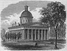 On January 11, 1820, the Indiana General Assembly authorized a committee to select a site in central Indiana for the new state capital.[37] The state legislature approved the site, adopting the name Indianapolis on January 6, 1821.[2] In April, Alexander Ralston and Elias Pym Fordham were appointed to survey and design a town plan for the new settlement.[38] Indianapolis became a seat of county government on December 31, 1821, when Marion County, was established. A combined county and town government continued until 1832 when Indianapolis incorporated as a town. Indianapolis became an incorporated city effective March 30, 1847. Samuel Henderson, the city's first mayor, led the new city government, which included a seven-member city council. In 1853, voters approved a new city charter that provided for an elected mayor and a fourteen-member city council. The city charter continued to be revised as Indianapolis expanded.[39] Effective January 1, 1825, the seat of state government moved to Indianapolis from Corydon, Indiana. In addition to state government offices, a U.S. district court was established at Indianapolis in 1825.[40]